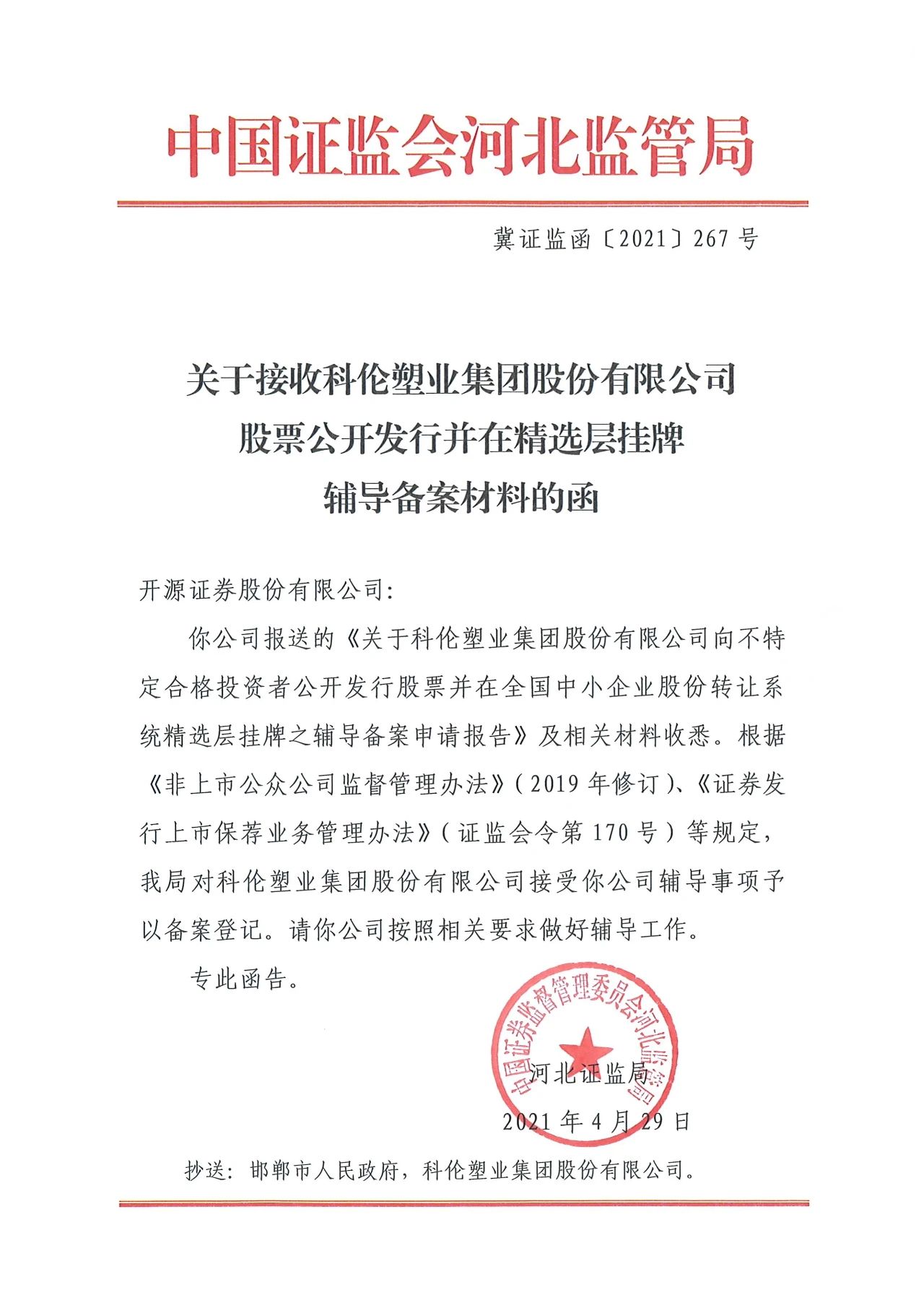 中國證監(jiān)會(huì)河北監(jiān)管局批準(zhǔn)開源證券對(duì)科倫塑業(yè)集團(tuán)進(jìn)行上市輔導(dǎo)