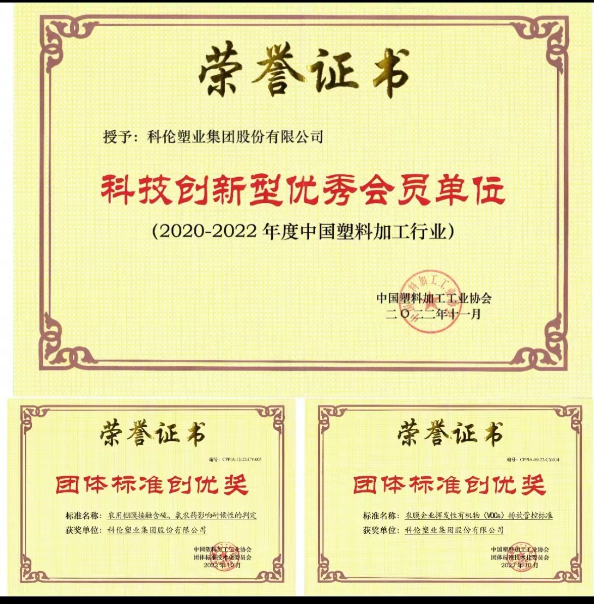 展會期間,公司有關(guān)人員先后參加了中國塑協(xié)專家委員會換屆大會暨塑料新材料新技術(shù)新成果交流會、中國塑協(xié)團體標準化技術(shù)委員會2022年年會和《農(nóng)業(yè)用功能性聚烯烴涂覆棚膜》團體標準技術(shù)研討會。取得了可喜成績,獲得三項殊榮。分別是2020-2022年度科技創(chuàng)新型優(yōu)秀會員單位、團體標準創(chuàng)優(yōu)獎兩項。