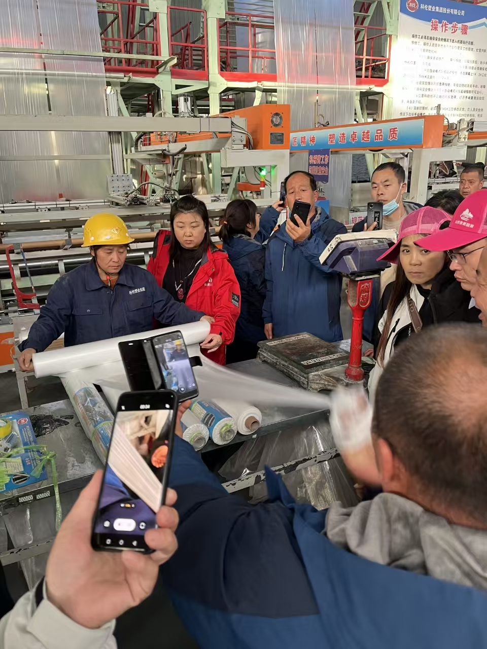 在集團領導和公司銷售、技術人員的帶領下,考察團參觀了功能棚膜車間、地膜車間、技術研發(fā)中心、展廳等處??苽愃軜I(yè)先進的集中棚膜供料設備、智能化地膜自動卷取系統(tǒng)、一流的檢驗檢測儀器受到廣大客商的高度關注和充分肯定。